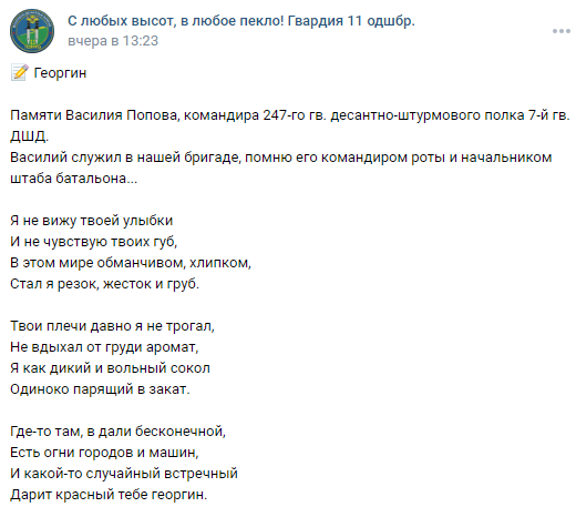 У російській соціальній мережі з'явилися дивні вірші, присвячені пам'яті Василя Попова, який до того обіймав посади командира роти та начальника штабу батальйону 247-го десантно-штурмового полку.