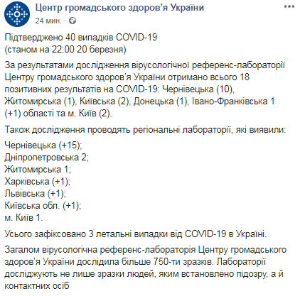 Станом на 22:00 20 березня в Україні було підтверджено вже 39 випадків захворювання на коронавірус Covid-19: 10 нових випадків в Чернівецькій області.