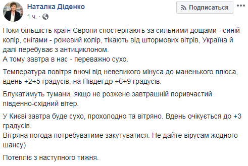 "У Києві завтра буде сухо, прохолодно та вітряно. Вдень очікується до +3 градусів", - пише Діденко.