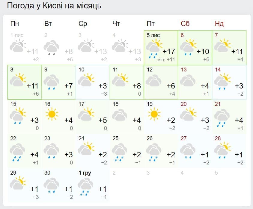 У столиці до кінця місяця вдень буде плюсова температура. Так, 5 листопада вона становитиме +17 градусів, а наприкінці місяця, 30 числа – лише +1. Нічна температура повітря коливатиметься від +7 до -3 градусів. Перший сніг у Києві прогнозують на 25 листопада.