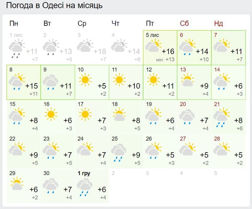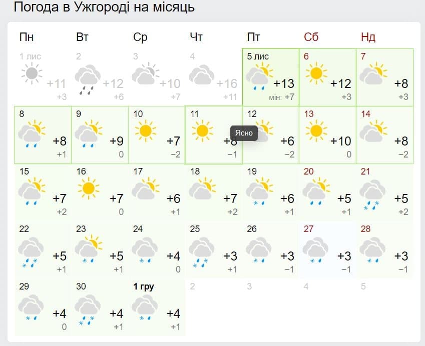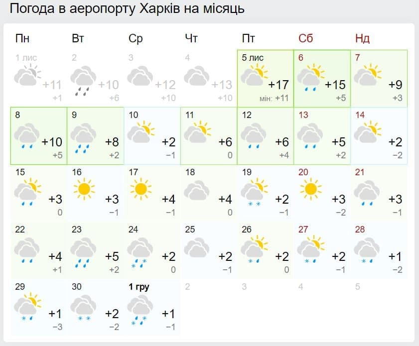 У Харкові вдень протягом місяця стовпчики термометрів також не опускатимуться нижче нуля, а нічний мінімум становитиме -3 градуси. Сніг прогнозують на 19 листопада.