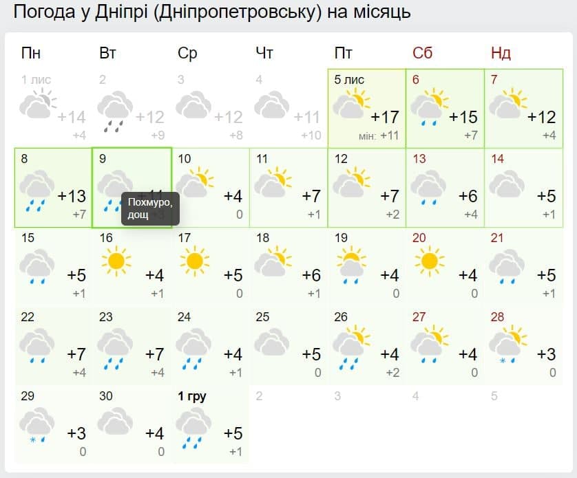 У Дніпрі денних мінусів також не очікується, вночі найхолодніша температура повітря – 0 градусів. Перший сніг у місті очікується 28 листопада.