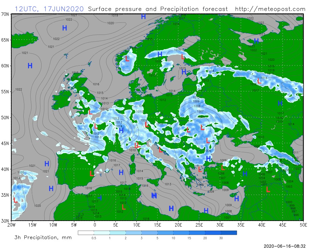 У середу, 17-го червня, дощі також ймовірні в північних областях України та локально - в центральних. На півдні і сході - без опадів, лише на Харківщині є шанс для періодичного дощу з грозою.