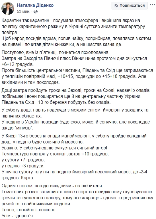 Синоптик Наталка Діденко попередила українців про похолодання, яке прийде в Україну вже у п'ятницю, 13 березня.