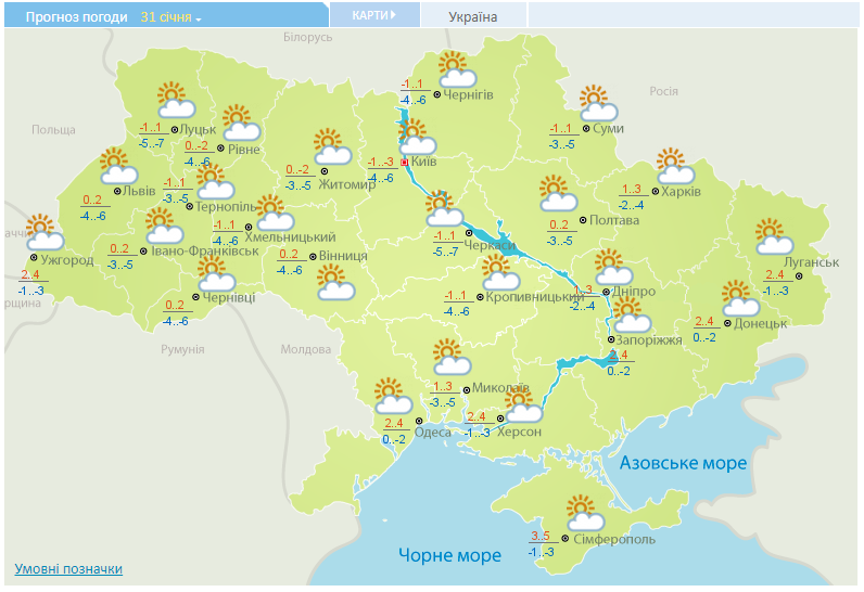 Впродовж 30-31 січня в Україні збережеться хмарна з проясненнями погода.