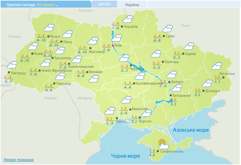 У вівторок, 2 лютого, істотних опадів не очікується, лише вночі на Лівобережжі пролітатиме невеликий сніг, однак стовпчики термометрів опустяться нижче. Так, температура вночі становитиме 3-10° морозу, у північній частині та в Карпатах до 12°, вдень 1-6° морозу, у південних, східних та Дніпропетровській областях вночі від 3° морозу до 3° тепла, вдень 1-6° тепла.