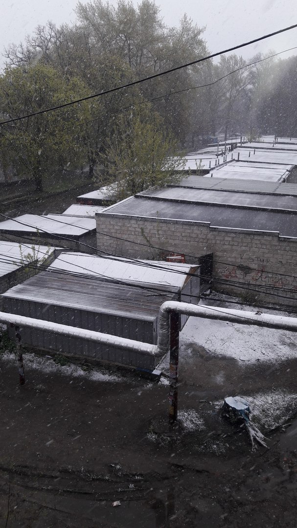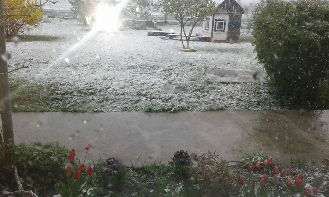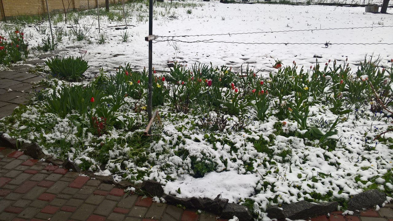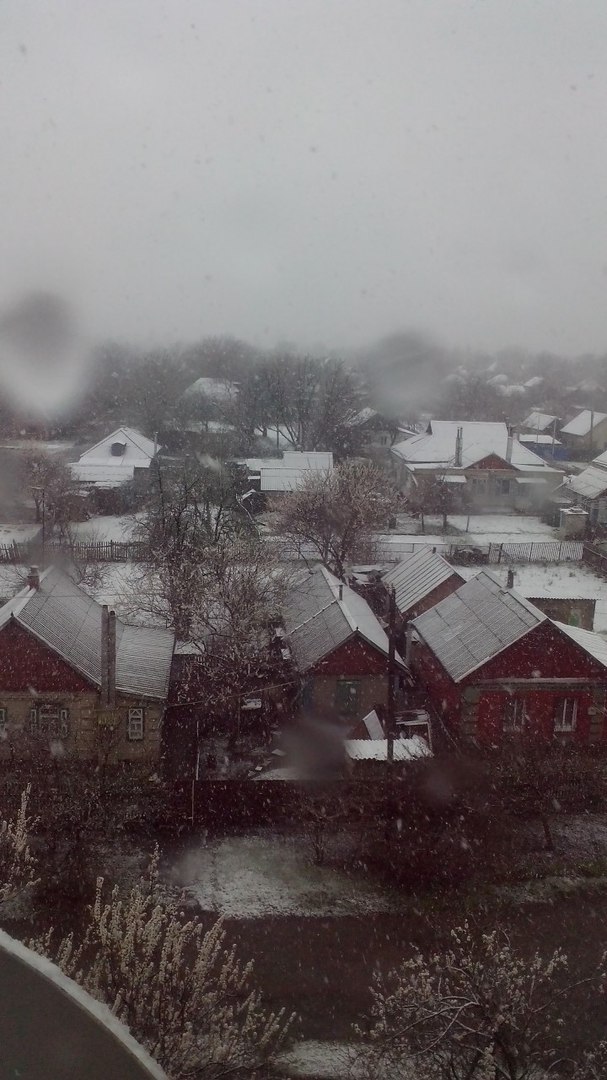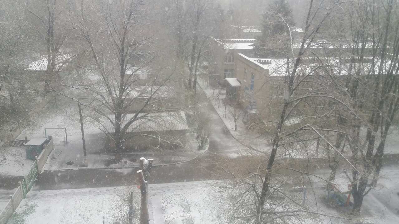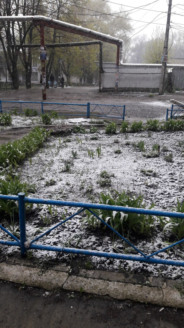 Фото снігу, який випав посеред весни, опубліковані в спільнотах в соцмережі "ВКонтакте" "Подслушано Лозовая" і "Типичный Днепр".