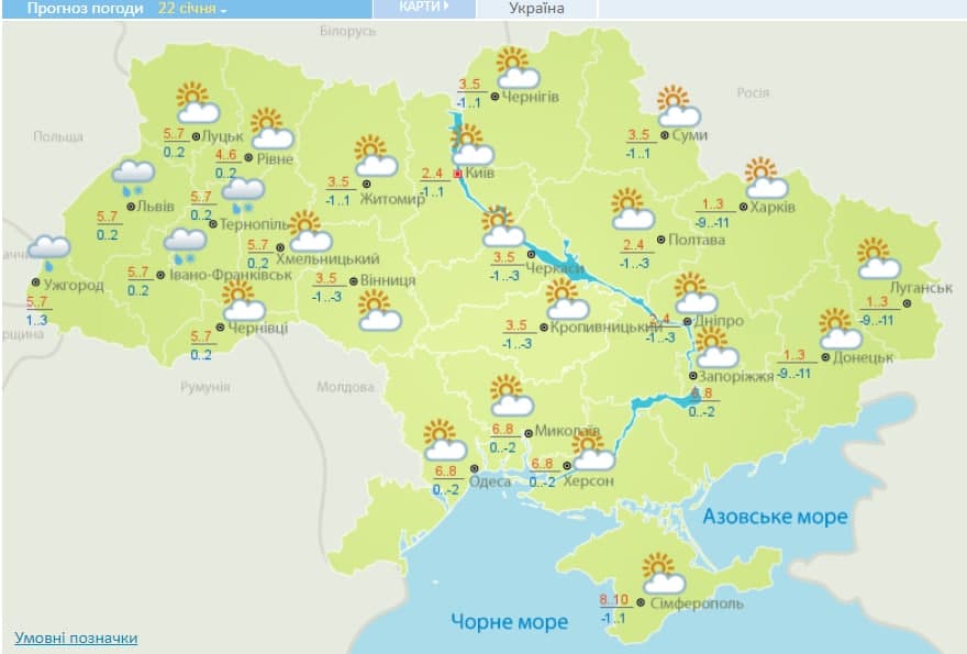Так, істотно потеплішає вже в п'ятницю, 22 січня. Найтепліше буде в південній частині країни - в Одеській, Миколаївській та Херсонській областях стовпчики термометрів піднімуться до плюс 8 градусів, а в окупованому Криму - до плюс 10. Найрохолодніше буде на сході України - вдень там очікується від 1 до 3 градусів тепла. На заході прогнозуються дощі та мокрий сніг.