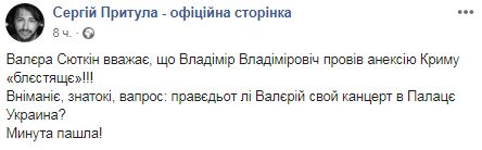 "Валера Сюткін вважає, що Володимир Володимирович провів анексію "блискуче"!!! Увага, знавці, питання: чи проведе Валерій свій концерт в "Палаці Україна"? Хвилина пішла!", - написав шоумен.