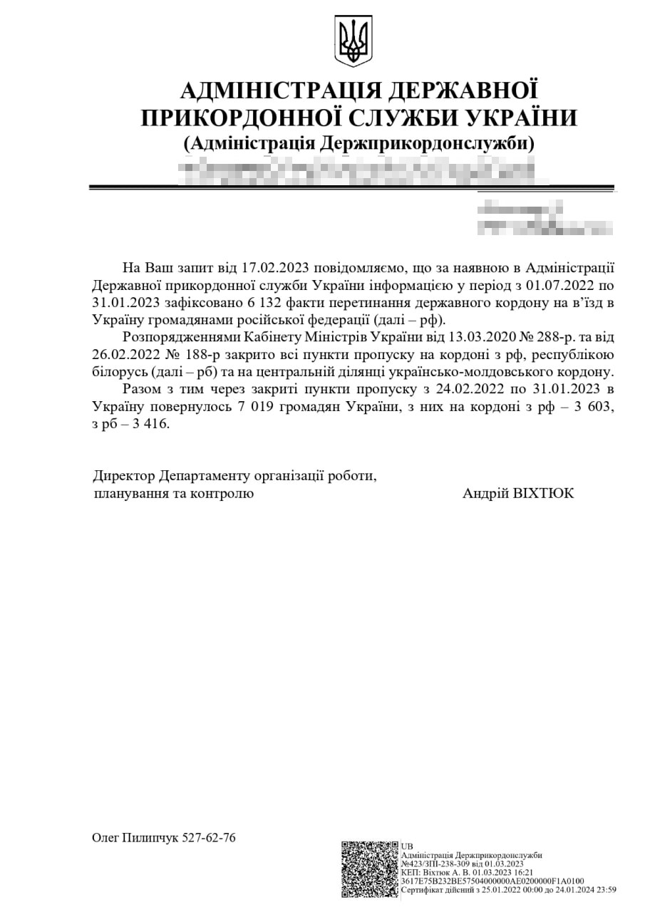 "У період з 01.07.2022 по 31.01.2023 зафіксовано 6 132 факти перетинання державного кордону на в"їзд в Україну громадянами Російської Федерації (далі – РФ). Разом з тим через закриті пункти пропуску з 24.02.2022 по 31.01.2023 в Україну повернулось 7 019 громадян України, з них на кордоні з РФ – 3 603, з РБ – 3 416", - йдеться у відповіді.