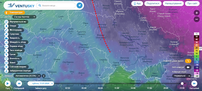 В суботу, 13 січня, зранку морози ще більш посиляться та складатимуть на сході країни до -18. В той же час на заході країни, у Львівській, Рівненській і Тернопільській областях очікується потепління до -2. На решті території країни до -11 -15.