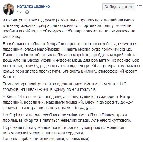 Український синоптик Наталка Діденко дала свіжий прогноз погоди на п'ятницю, 14 лютого, - в країні потепліє.