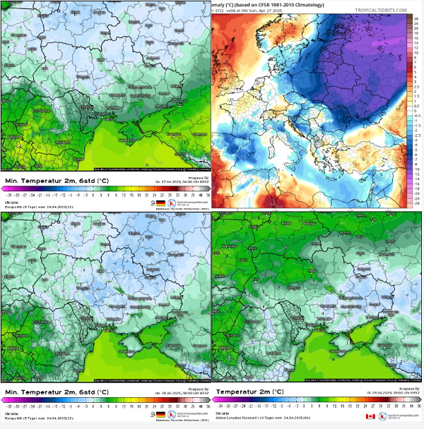 Відповідно до його прогнозу вночі та вранці 27 – 29 квітня мінімальні показники температури передбачаються в межах +1…+6 °С, на поверхні ґрунту у всіх регіонах прогнозуються заморозки до -1…-6 °С. У західних (окрім Закарпаття), центральних, північних та східних областях очікуються сильні заморозки у повітрі 0…-5 °С. На півдні також місцями можливі заморозки у повітрі 28 квітня. Вдень повітря прогріватиметься до +8…+14 °С, на півдні та у західній частині +15…+21 °С; 29 та 30 квітня вдень очікується поступове підвищення до +17…+22 °С у більшості областей.