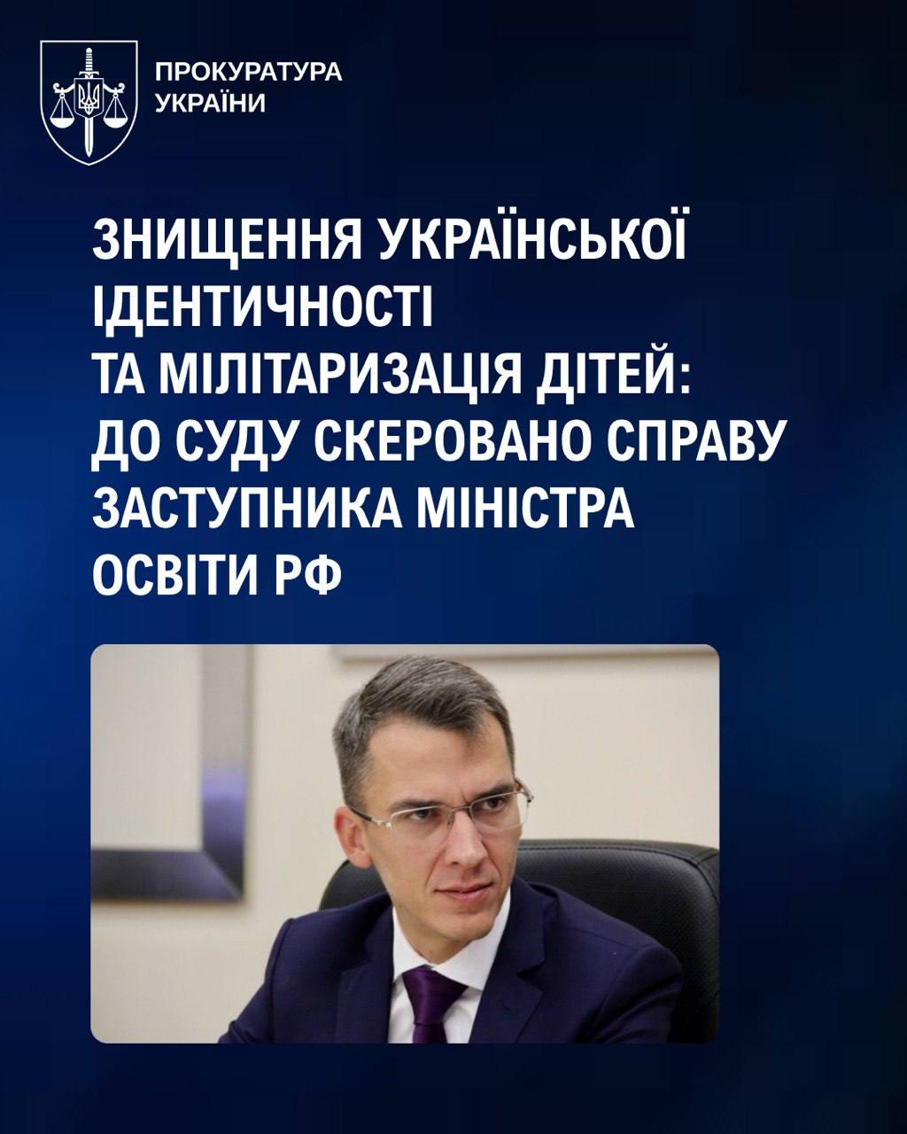 В Україні заочно будуть судити заступника голови Міністерства освіти РФ Андрія Омельчука через мілітаризацію дітей та знищення української ідентичності. Матеріали кримінальної справи щодо посадовця передали до суду.