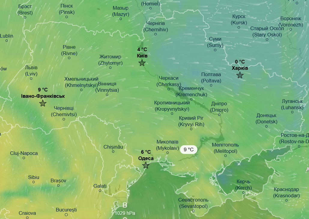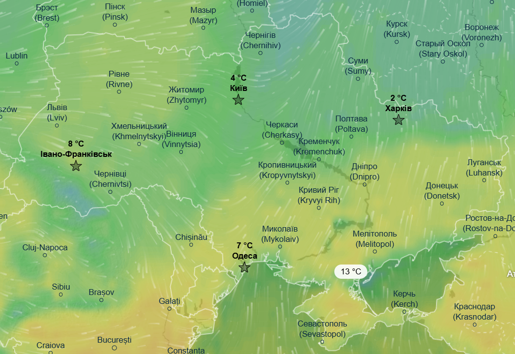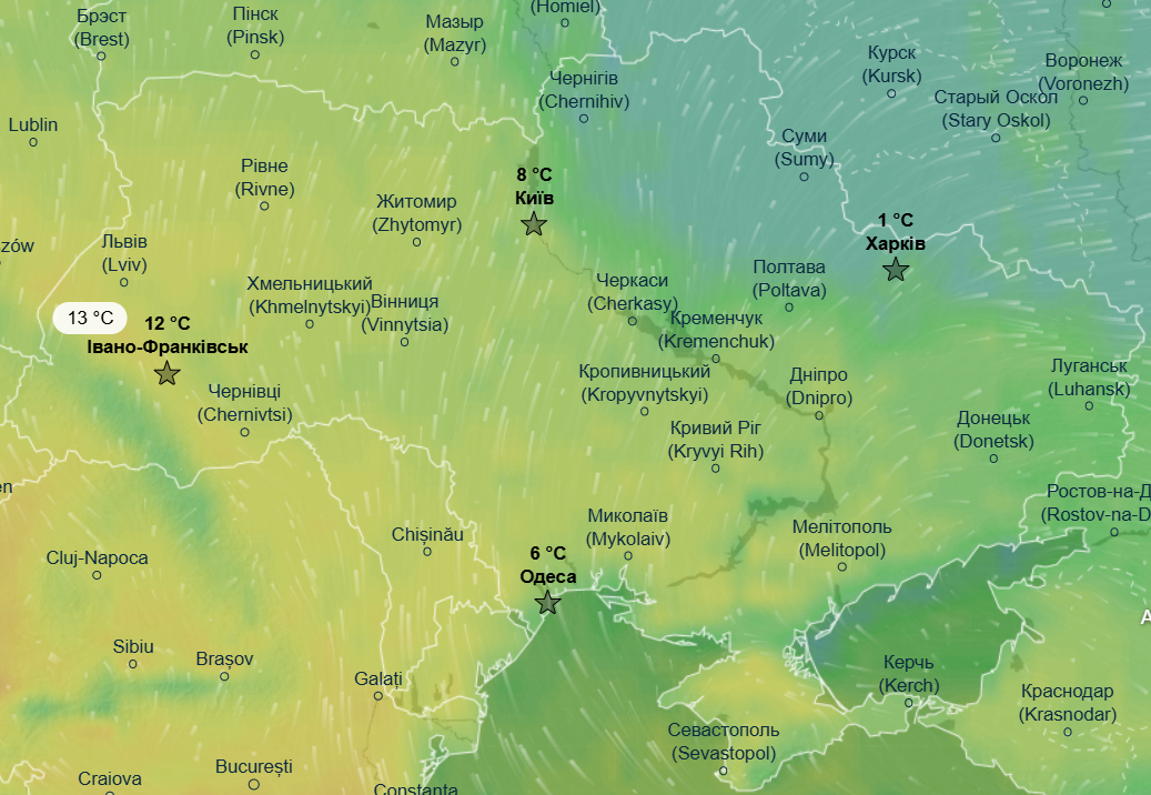 Перший день весни буде прохолоднішим, ніж попередній, а хвиля потепління пошириться на південні області. У неділю, 1 березня, найтепліше буде на півдні та сході країни, де термометри покажуть до +13 °С, і на Рівненщині та Волині, де очікується до +9 °С. На решті території країни синоптики прогнозують денну температуру в межах -2...+8 °С.