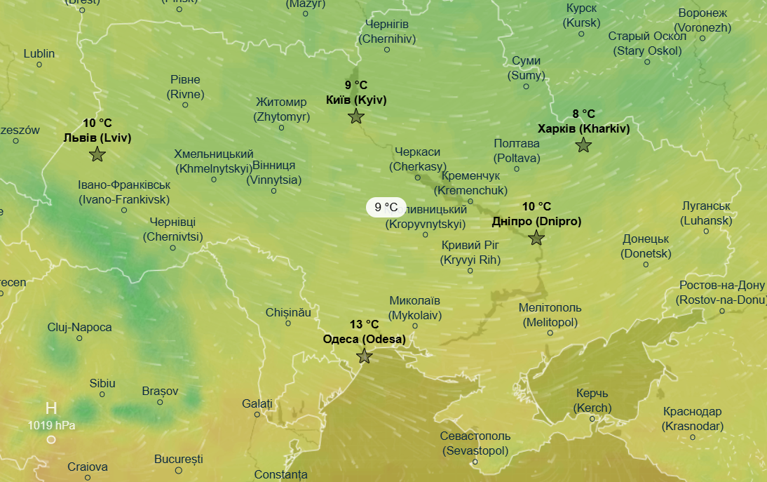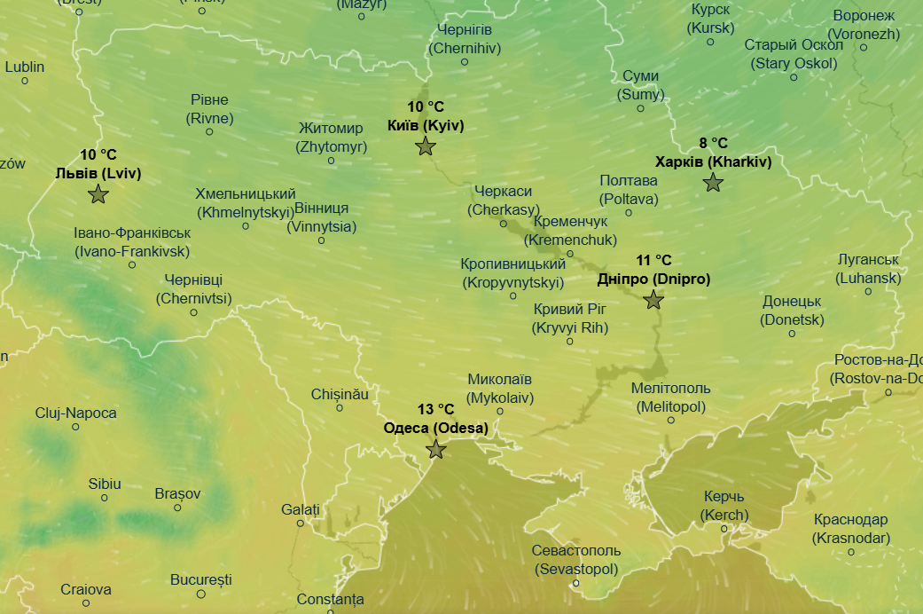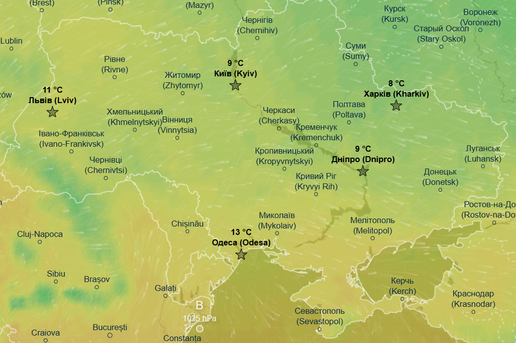 У вівторок, 14 жовтня, в Україні очікується прохолодна погода з температурою повітря від +5 до +13 градусів, при цьому в південному регіоні денний максимум складе +14 градусів.