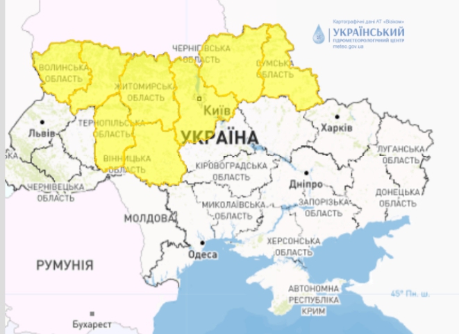 За даними синоптиків, під І рівень небезпеки сьогодні підпадають наступні області: Волинська, Рівненська, Житомирська, Хмельницька, Вінницька, Київська, Чернігівська та Сумська.