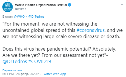 На прес-конференції Гебреісуc зазначив, що коронавірус, спалах якого зафіксована в ряді країн світу, має потенціал пандемії. За його словами, на сьогодні в ситуації з коронавірусом немає неконтрольованого глобального поширення, а також великомасштабних важких захворювань або випадків смерті.