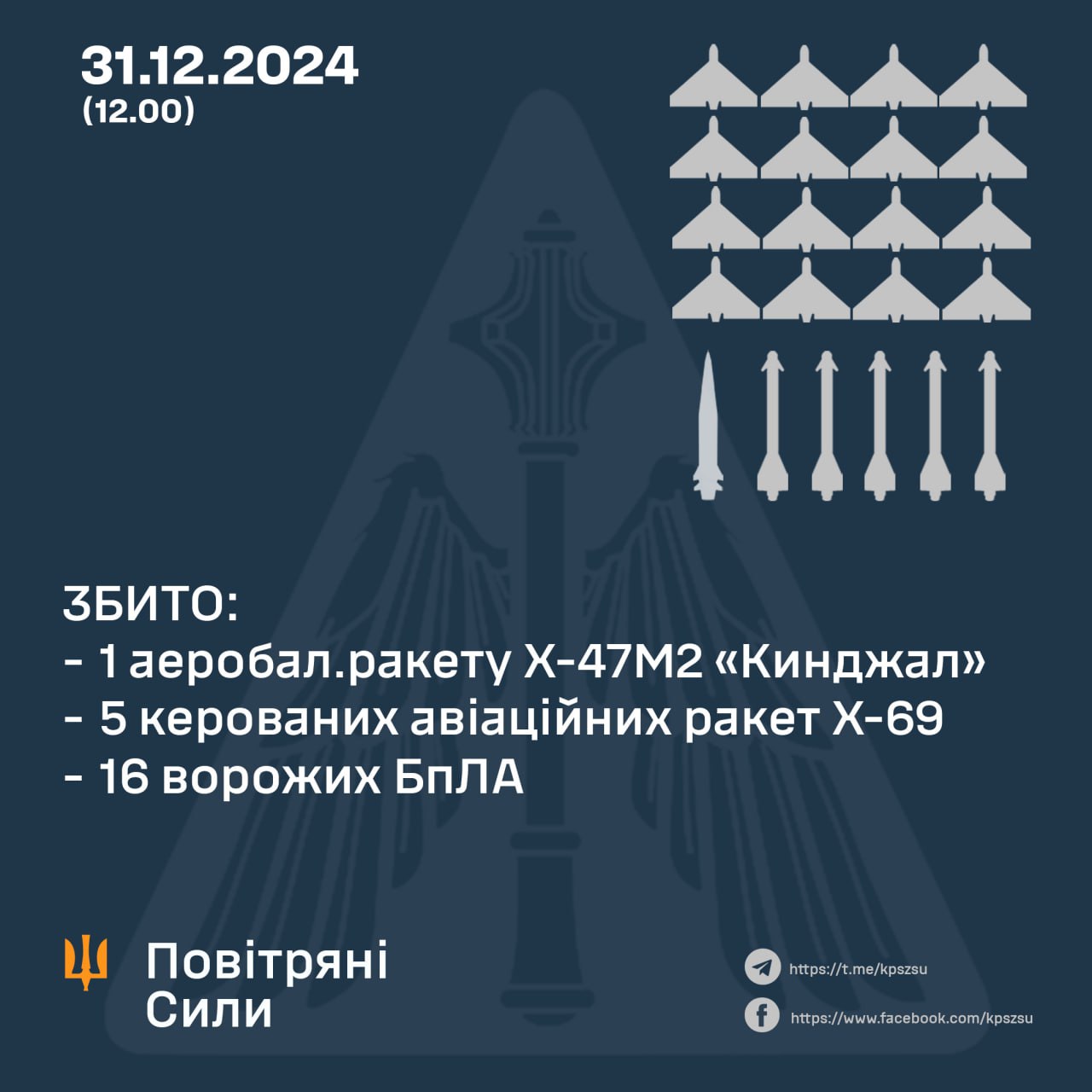 У ніч на 31 грудня (із 20:30 30 грудня) російські війська застосували по Україні 61 засіб повітряного нападу.