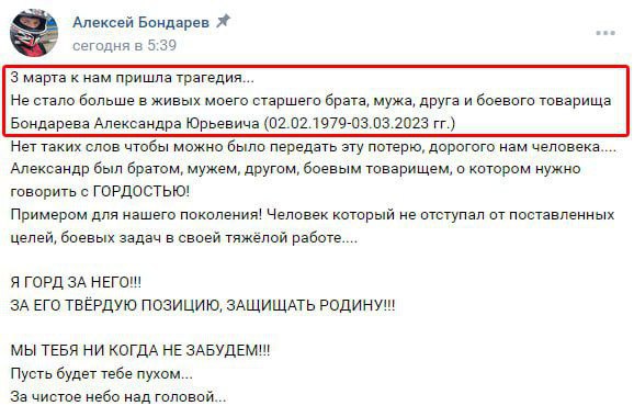 "Начальник служби безпеки польотів 559б авіаційного полку, старший інспектор-льотчик майор Олександр Бондарєв. Бомбіл Харків та інші міста України. 3 березня 2023 р. успішно демобілізовано", - написав він.
