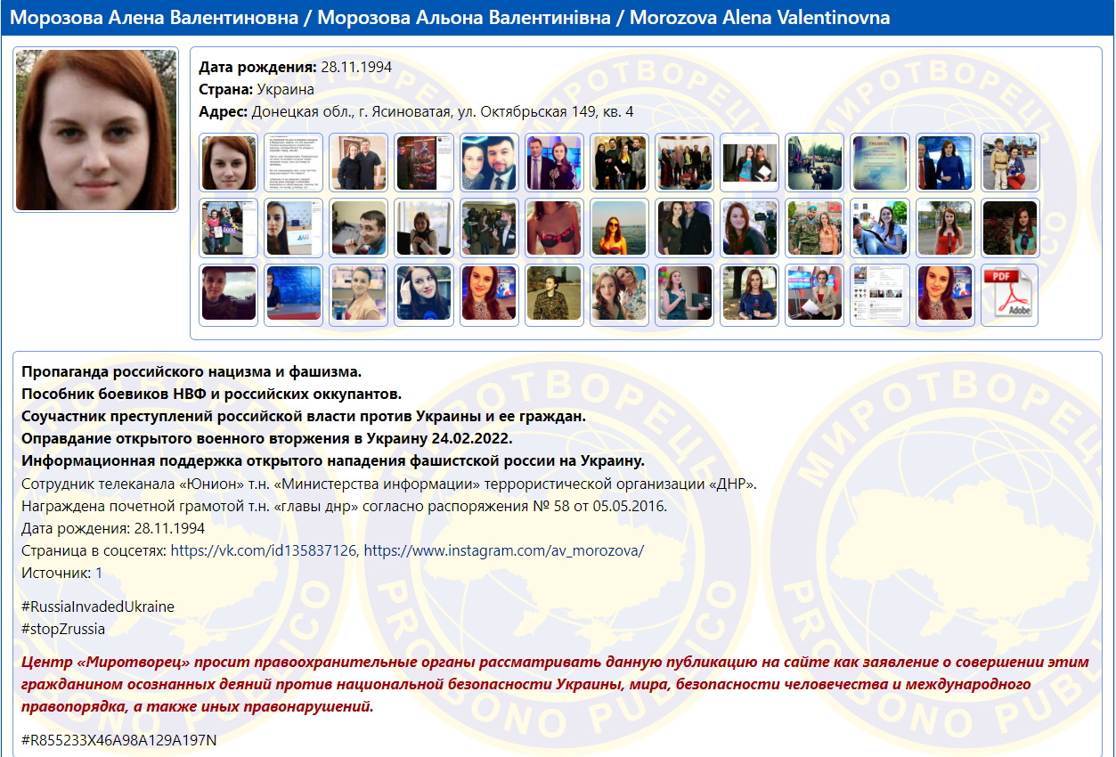 За даними"Миротворця", 27-літня пропагандистка російського нацизму та фашизмуМорозова виправдовує та відкрито підтримує російське військове вторгнення Росії на територію України. Також в її файлі на сайті згадується, що вона отримала почесну грамоту "глави ДНР". Морозова є співучасницею злочинів влади РФ проти українського народу та посібником бойовиків НВФ і окупантів.