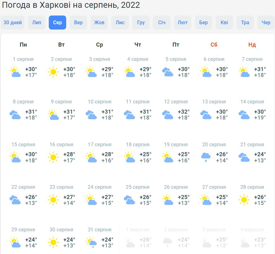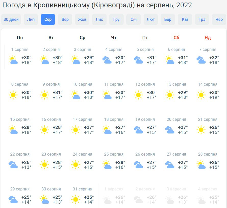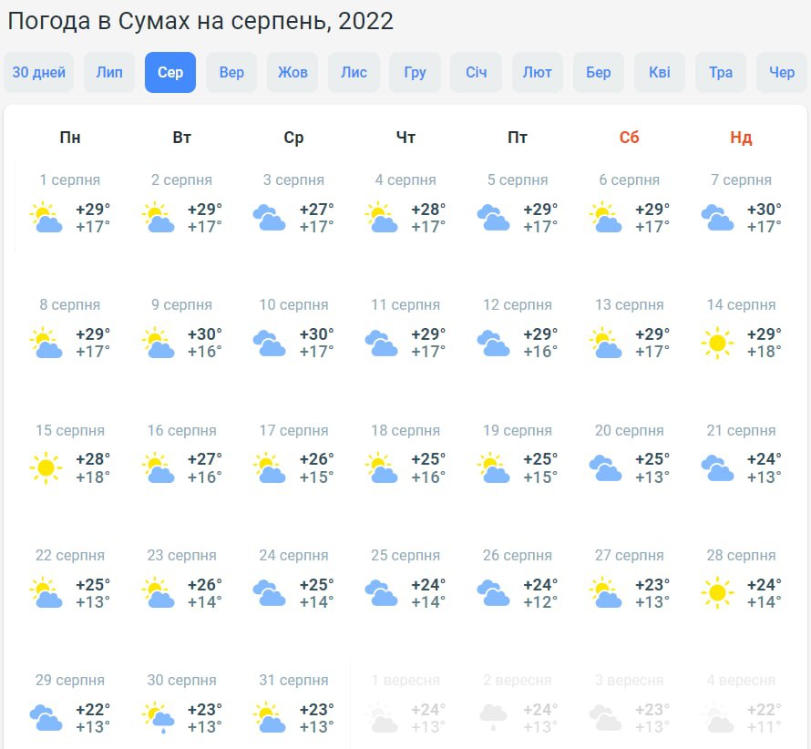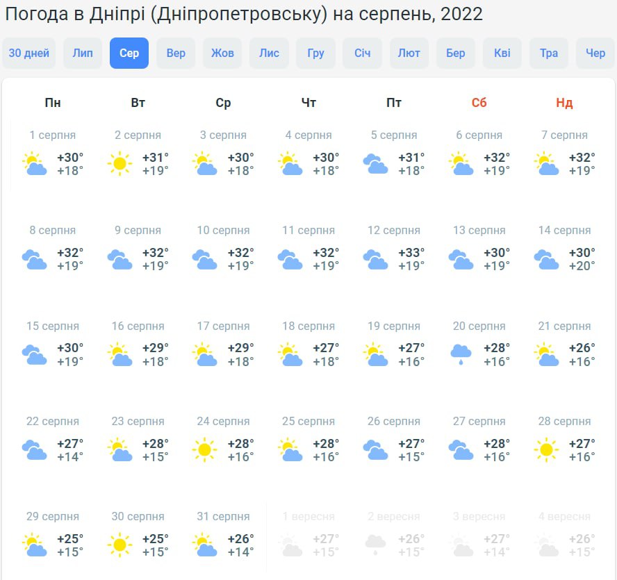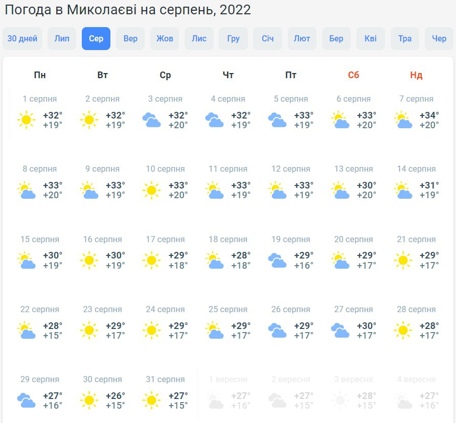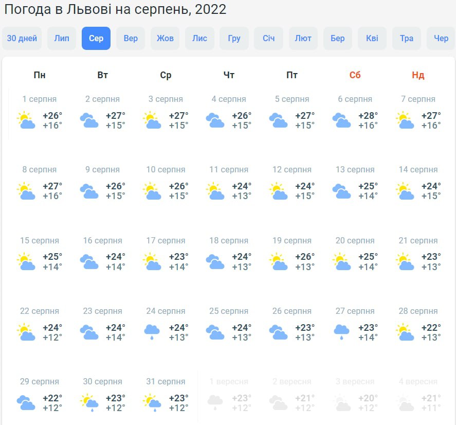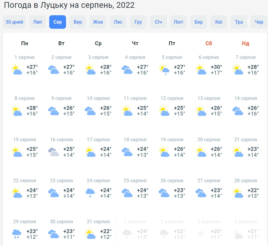 На півночі країни у першу половину серпня буде +27...+30 градусів. Надалі стовпчики термометрів коливатимуться у межах +22...+26 градусів. Буде хмарно з проясненнями, лише під кінець місяця прогнозують дощ.