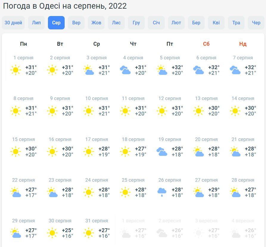 На півдні у третій місяць літа буде доволі спекотна погода. Зокрема, у Миколаєві очікується температура повітря очікується від +26 до +34 градусів. Буде хмарно з проясненнями, без опадів. А в Одесі на початку місяця буде +30...+32, надалі спека спаде. Прогнозують дощ 26 серпня.