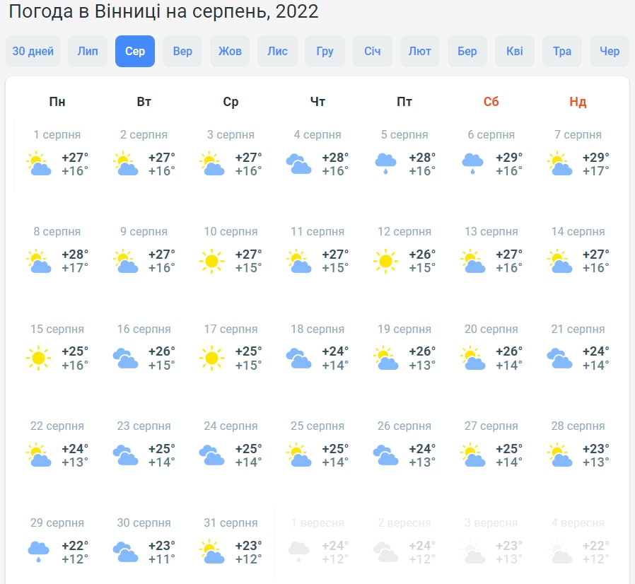 Зокрема, у Вінниці буде температура на рівні +27...+29 градусів, але у другу половину місяця спека спаде. Стовпчики термометрів коливатимуться у межах +22...+26. Буде переважно хмарно з проясненнями, на початку та в кінці серпня можливі опади.