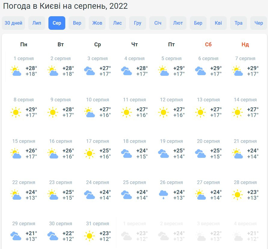 У Києві також у першу половину серпня буде спекотно +27...+28 градусів. Надалі стовпчики термометрів коливатимуться у межах +21...+26 градусів. Буде хмарно з проясненнями, 26 серпня прогнозують дощ.