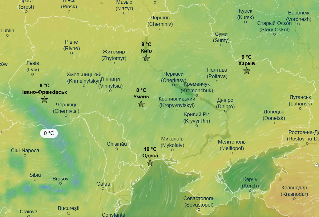 Найтеплішою частиною України в четвер буде Волинь та Рівненщина, а також Закарпаття, де вдень повітря прогріється до +13 °С. Тепло до +13 буде і в східному регіоні біля Азовського моря.