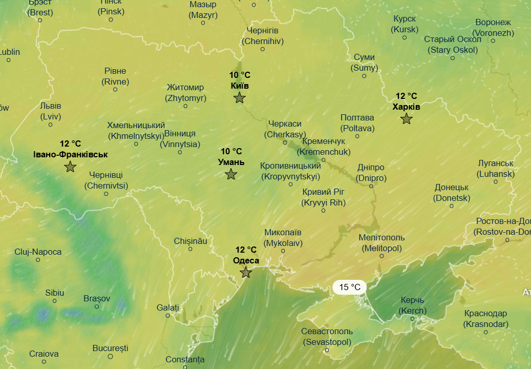 Тим часом в приморських регіонах та на Закарпатті очікується в межах +12...+15 °С.