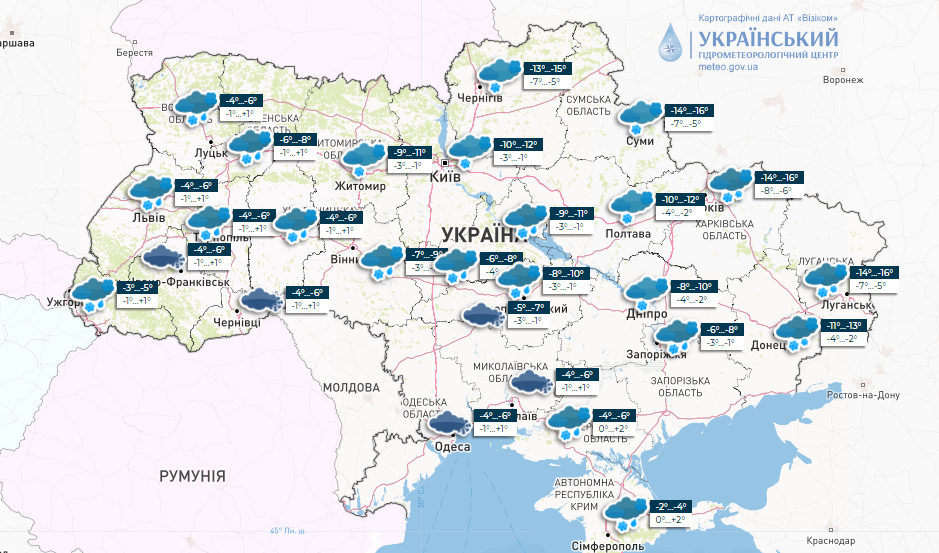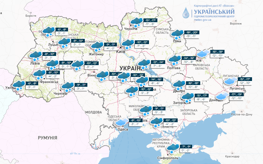 Температура вночі 9-15°, вдень 2-7° морозу, у східних, північно-східних областях та в Карпатах вночі 15-20°, вдень 8-14° морозу.