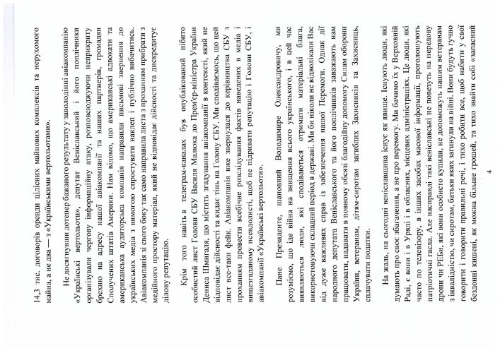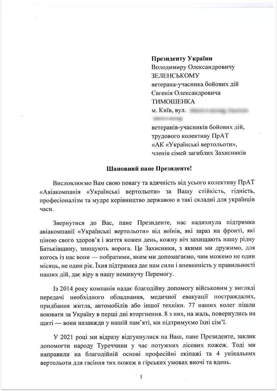 Люди просять керівника держави захистити авіакомпанію "Українські вертольоти" як соціально-відповідальний бізнес. Справа в тому, що в інтернеті шириться відео з маніпуляціями та наклепами, які дискредитуют авіакомпанію від нардепа Федора Веніславського.