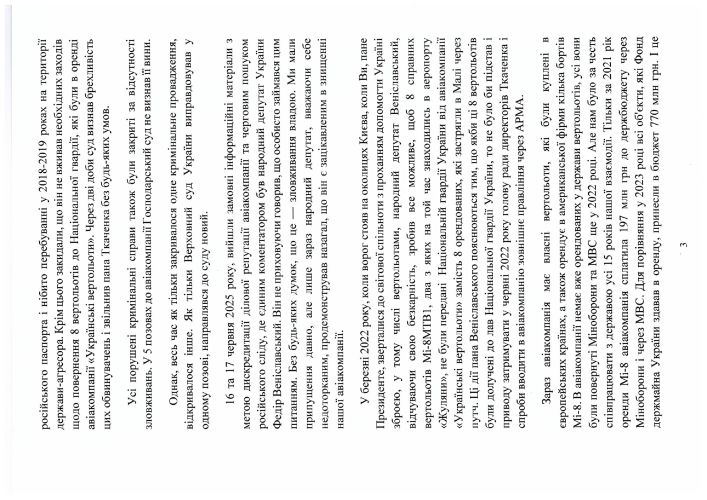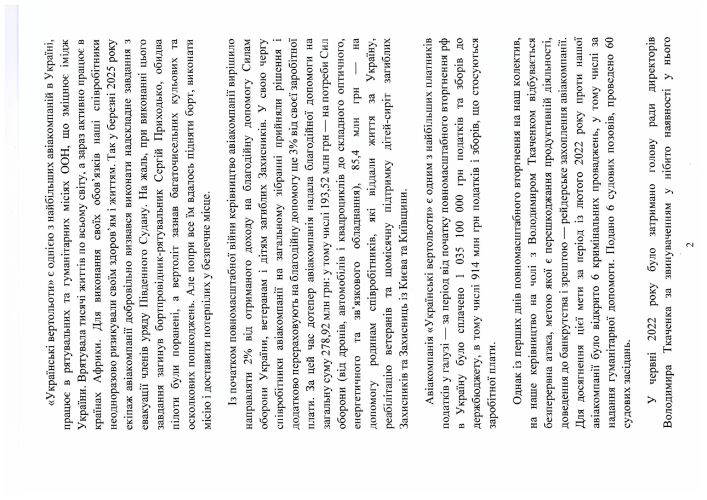 На переконання підписантів звернення, компанія"Українські вертольоти" має продовжувати свою роботу без інформаційного тиску, адже сьогодні це означає не лише стабільність для сотень співробітників, а й безперервну підтримку фронту, дітей, які втратили батьків на війні та ветеранів.