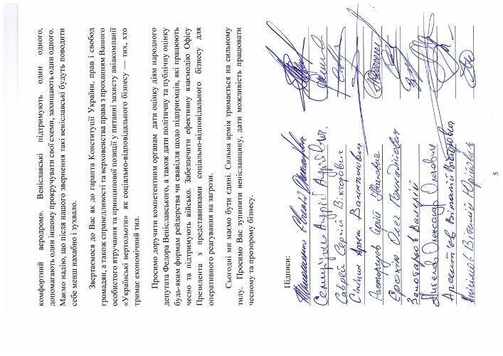 Підписанти попросили Володимир Зеленського доручити компетентним органам дати оцінку діям народного депутата Федора Веніславського, а також дати політичну та публічну оцінку будь-яким формам рейдерства чи свавілля щодо підприємців, які працюють чесно та підтримують військо.