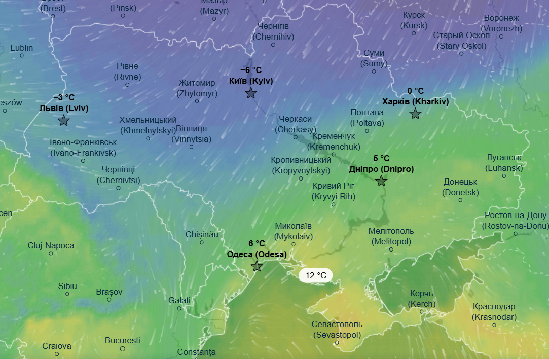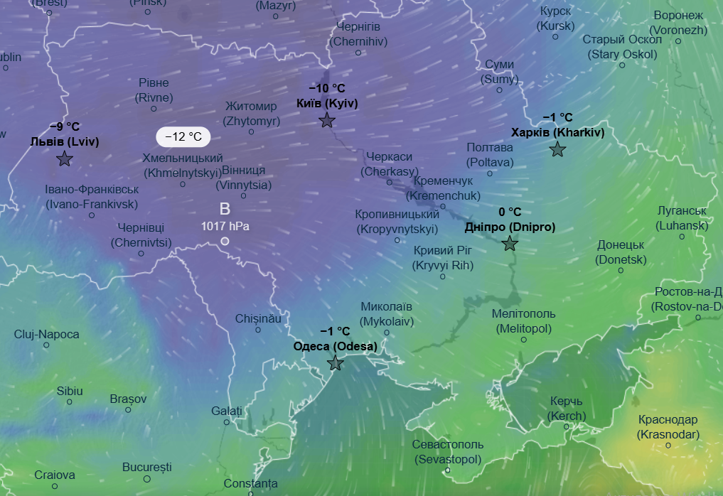 Вдень в неділю буде морозно на всій території України, окрім східних та південних областей. Термометри покажуть близько -6...-12 °С на півночі, заході та в центрі країни, дещо тепліше буде на півдні — в межах 0...-1 °С. Стійкі "плюси" до +1...+3 °С прогнозуються на Донеччині та Луганщині.