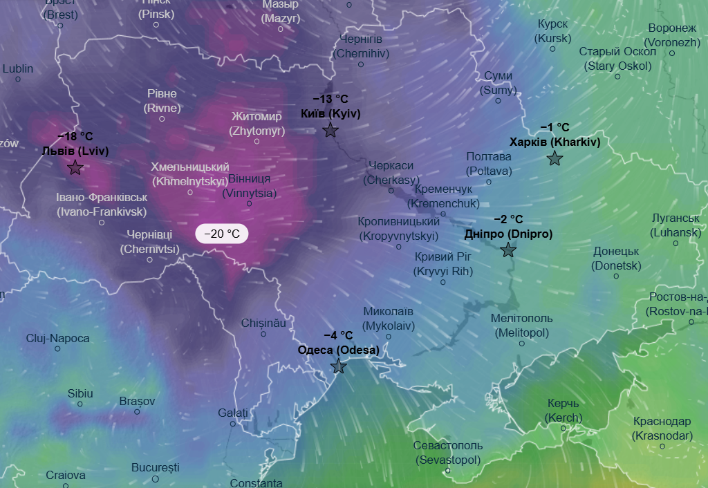 У ніч на неділю, 1 лютого, тріскучі морози до -20 °С повернуться в західні та центральні області України - епіцентр морозів розташується на Вінниччині, Хмельниччині та Житомирщині — там очікується до -20 °С, на Львівщині — до 18 °С. В східних та південних областях вночі 1 лютого очікується в межах +1...-4 °С.