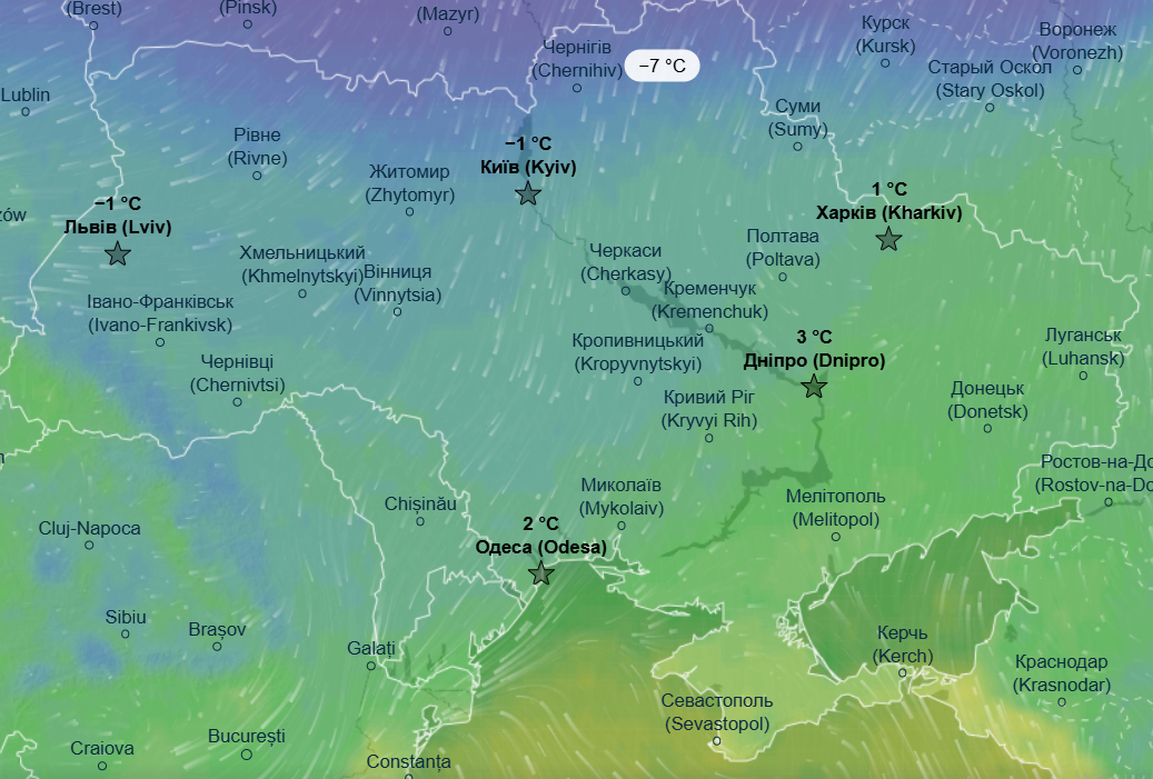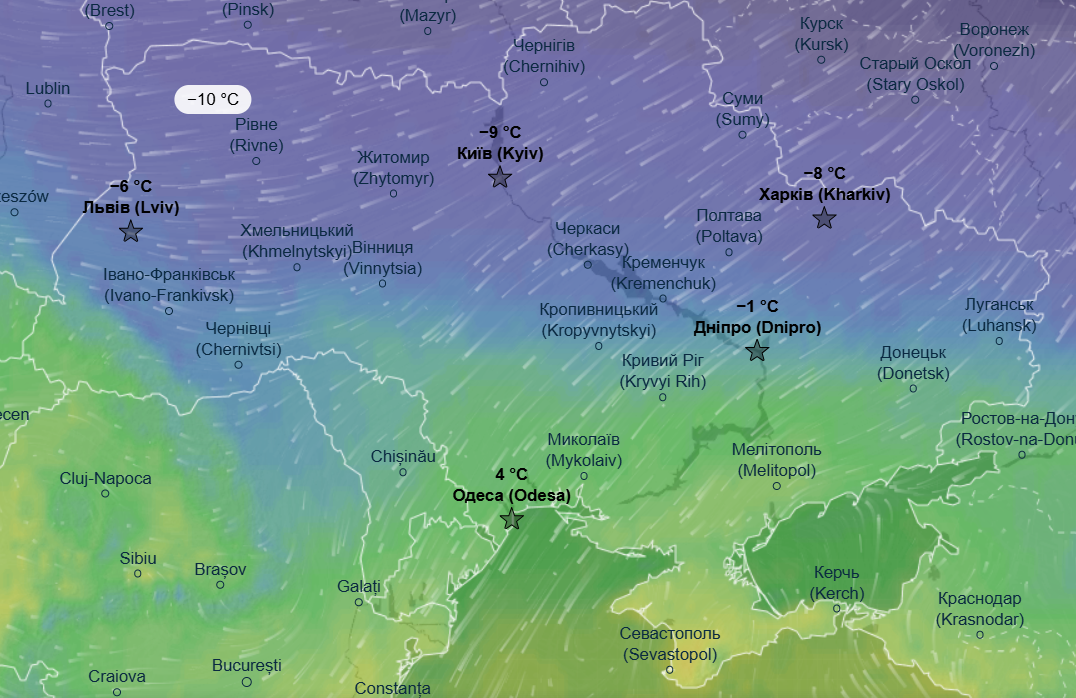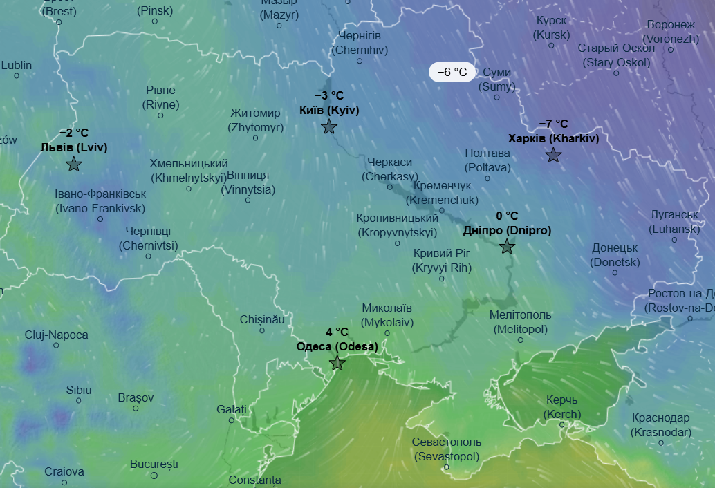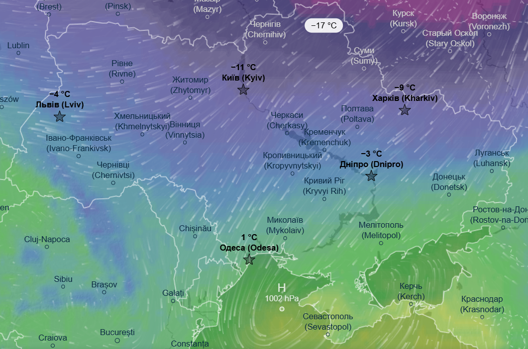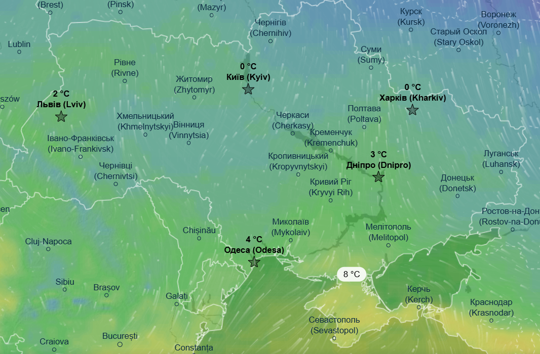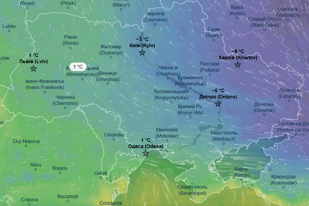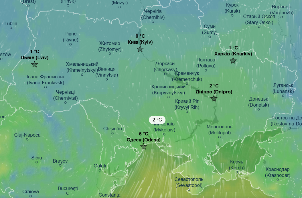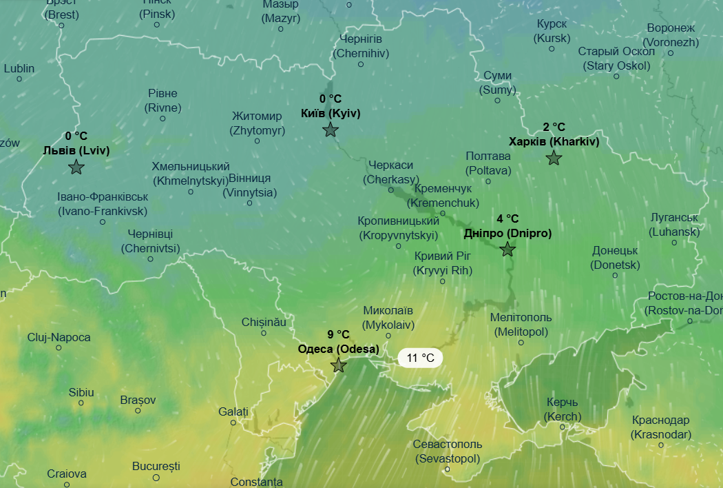 Вдень в східній частині країни також утримаються морози — від -3 до -8 °С. На решті території України очікується відлига і "плюси" — термометри покажуть від -2 до +2 °С.