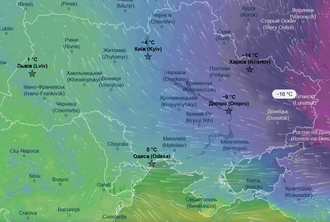 У вівторок, 27 січня, впродовж доби в Україні очікується морозна погода. Вночі синоптики прогнозують від +1 до -16 °С. Найхолодніше вночі буде на сході країни - до -16°С на Луганщині, а от в західних областях потепліє до +1 °С.