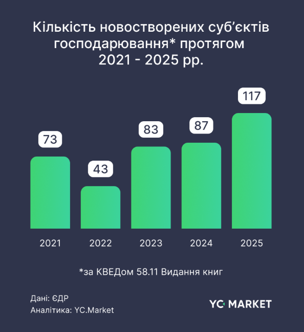 Згідно з дослідженням, у 2021 році в Україні з'явилося 73 нових суб'єкти господарювання у сфері видання книг. Через шок від війни, релокацію та логістичні збої у 2022 році цей показник упав до 43. Проте вже з 2023 року розпочалося пожвавлення: кількість реєстрацій зросла до 83, у 2024-му – до 87, а у 2025 році досягла пікової позначки у 117 нових гравців.