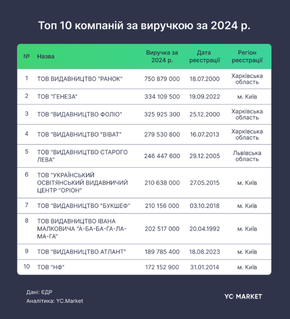 Лідером за доходами на ринку є видавництво "Ранок". Його виручка зросла з 255,3 млн грн у 2022 році до 842,2 млн грн у 2025-му. У топ-10 найуспішніших компаній за 2024 рік також увійшли "Генеза", "Фоліо", "Віват", "Видавництво Старого Лева", "Оріон", "Букшеф", "А-ба-ба-га-ла-ма-га", "Атлант" та "НФ".
