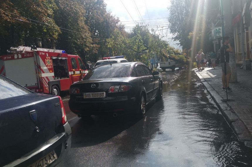 У центрі Вінниці на проїжджій частині дороги через велику кількість води утворилися великі калюжі, а на деяких вулицях вітром повалило старі дерева на дорогу.