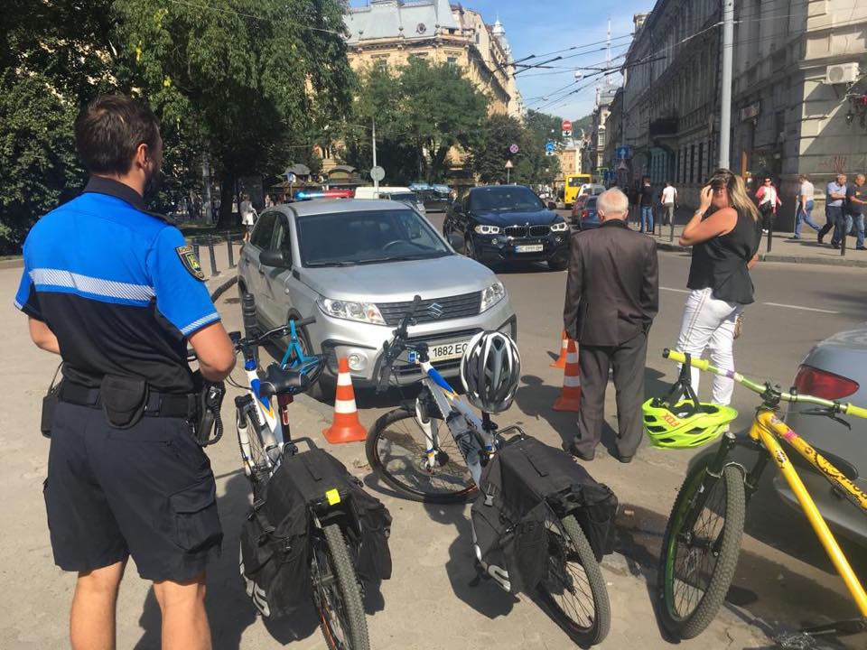 13 вересня на вул. Січових Стрільців у Львові водійка Suzuki, яка припаркувала своє авто у забороненому місці, наїхала на поліцейського з велопатруля.