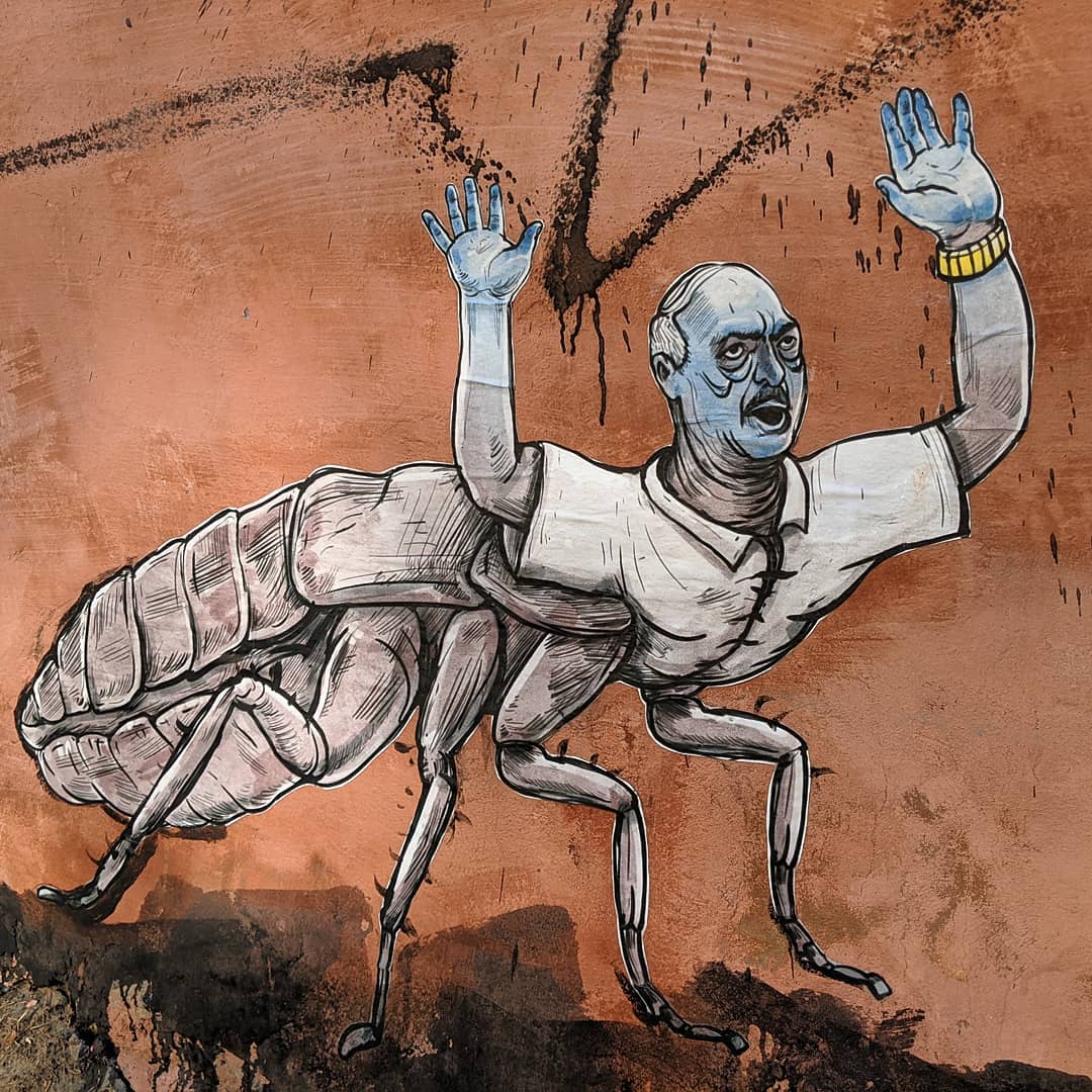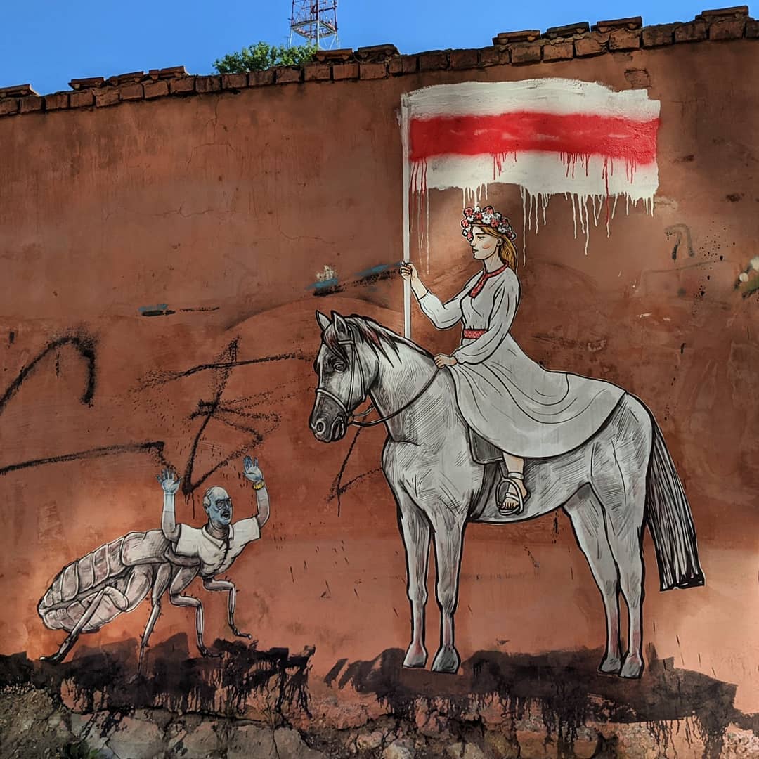 На барвистому графіті Олександр Лукашенко зображений в образі таргана, який підняв руки перед дівчиною на коні. Вона тримає в руці символ протестного руху в Білорусі - червоно-білий прапор.