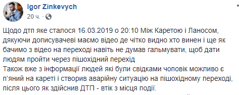 "Щодо дтп яке сталося 16.03.2019 о 20:10 Між Каретою і Ланосом, дякуючи дописувачеві маємо відео де чітко видно, хто винен і ще як бачимо з відео на переході навіть не думав гальмувати, щоб дати людям пройти через пішохідний перехід", - написав він.