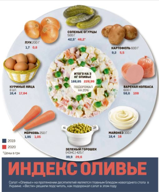 Що стосується звичного олів'є, то він подорожчав приблизно на 20%. Якщо минулого року при приготуванні 3 кг салату потрібно було купити продуктів на 188,65 гривень, то в 2020 році - на 226,99 гривень.