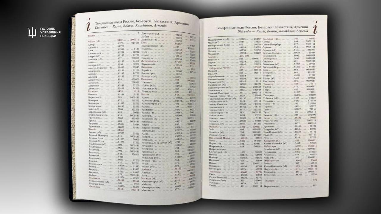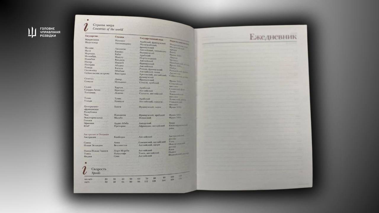 В ГУР розповідають, що на перших сторінках росіяни розмістили довідник з телефонними кодами, торговими штрихкодами та іншими відомостями про усі країни світу, крім України.