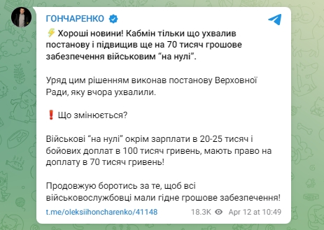 "Кабмін тільки що ухвалив постанову і підвищив ще на 70 тисяч грошове забезпечення військовим "на нулі". Уряд цим рішенням виконав постанову Верховної Ради, яку вчора ухвалили. Що змінюється? Військові "на нулі" окрім зарплати в 20-25 тисяч і бойових доплат в 100 тисяч гривень, мають право на доплату в 70 тисяч гривень", - написав Олексій Гончаренко.