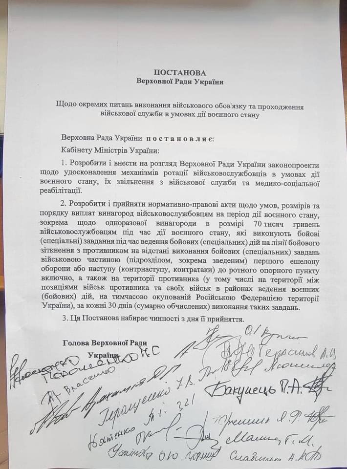 Кабінет Міністрів України виконав постанову Верховної Ради та підвищив на 70 тисяч гривень грошове забезпечення військовим, які виконують бойові завдання на передовій.