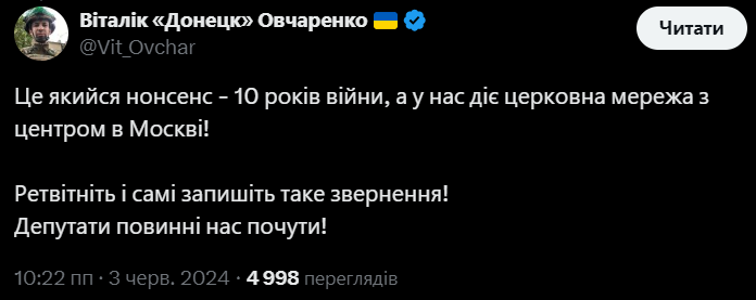 Зокрема у соцмережі Х Овчаренко також залишив наступний допис: "Це якийся нонсенс - 10 років війни, а у нас діє церковна мережа з центром в Москві!".